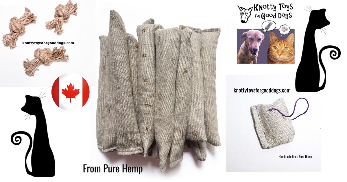 For cats, we highly recommend our hemp favourites, Knotty Bon Bons, Knotty Nips for Cool Cats, & the Knotty Kitty Kicker. They’re purrfect for batting, kicking, & conquering, all made from purre natural hemp with no plastics, chemicals, or toxins.