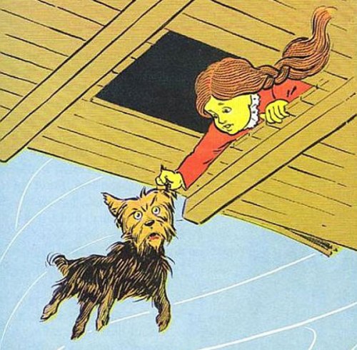 In L. Frank Baum’s Oz books, Dorothy’s faithful companion is a little dog named Toto. Toto seems to be just a normal dog at first, but in later books, as other animals are revealed to have the ability to speak, Toto finally admits that he can speak too but chooses not to.