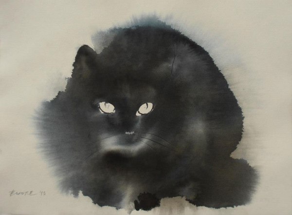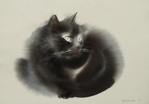 Hello everyone, CEO Olivia here. Today I’m sharing some of the artwork of Serbian artist Endre Penovac. Specifically his series of black cats done in water colors that I found to be pawsome. Have a look.