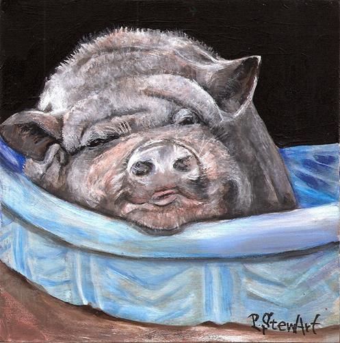 Hi everyone, CEO Olivia here once again. The other day my pig-bro GG asked me why I haven’t shown any pigs in art? I apologized to him & promised to correct the situation right away. Pigs are wonderful, social animals, but they aren’t for just anyone. Imagine a 200 lb. toddler with a demanding nature who’ll be with you for 20 or more years.