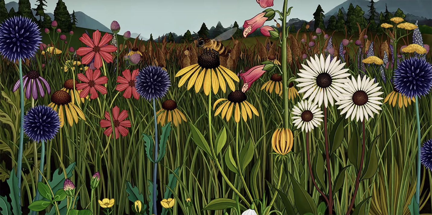 Spanning from day to night; from sunshine to rain & wind, “Story of Flowers” shows the various stages of botanical growth. Illustrated by Katie Scott, animated by James Paulley, & directed by Azuma Makoto, “Story of Flowers’, depicts the interconnected networks within an ecosystem, like the organisms underground fertilizing the soil or a pollinating bumblebee. Head to Instagram to sniff out more work from ScottPaulley, & Makoto.