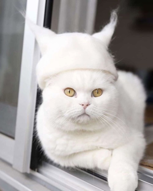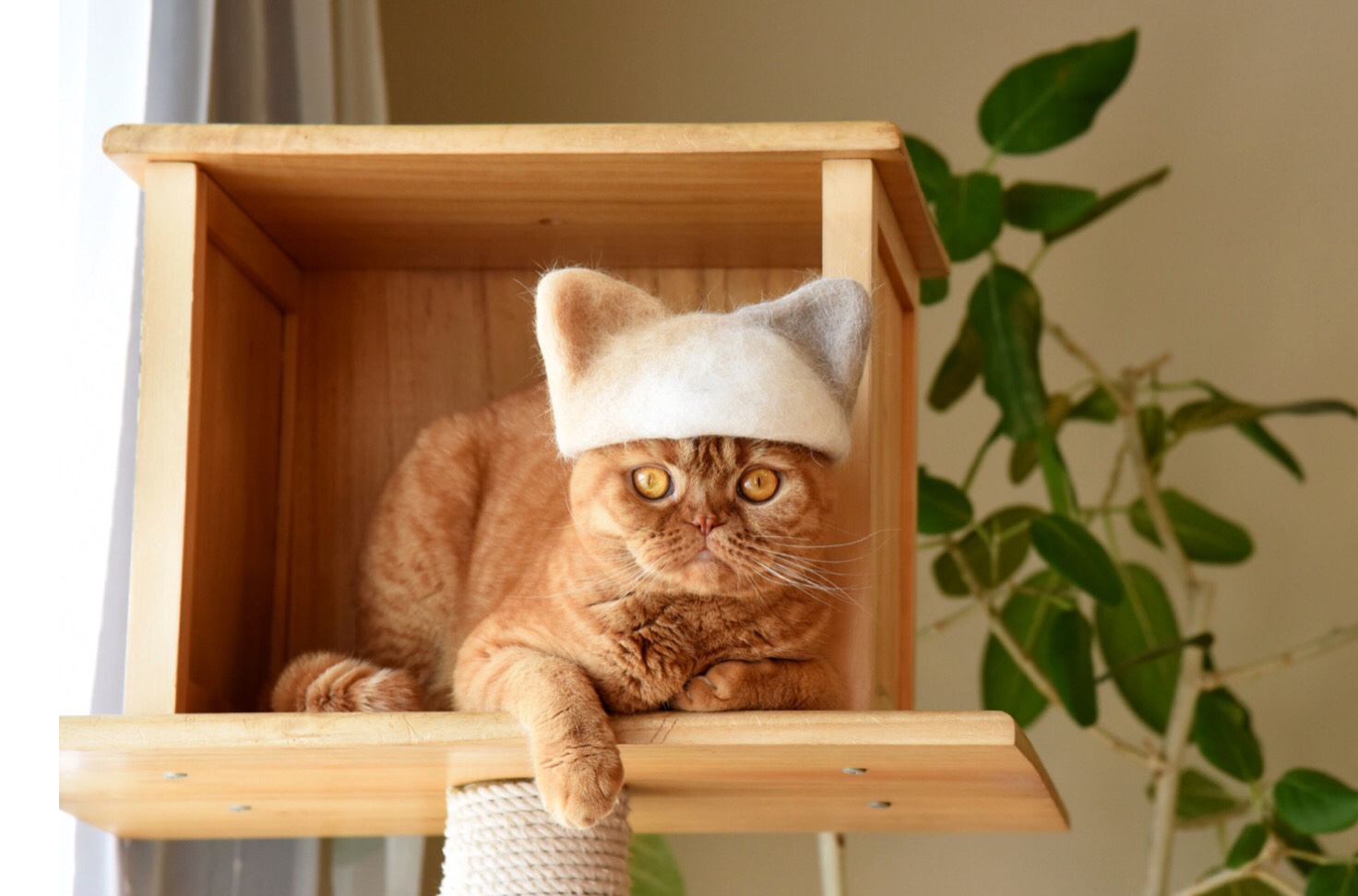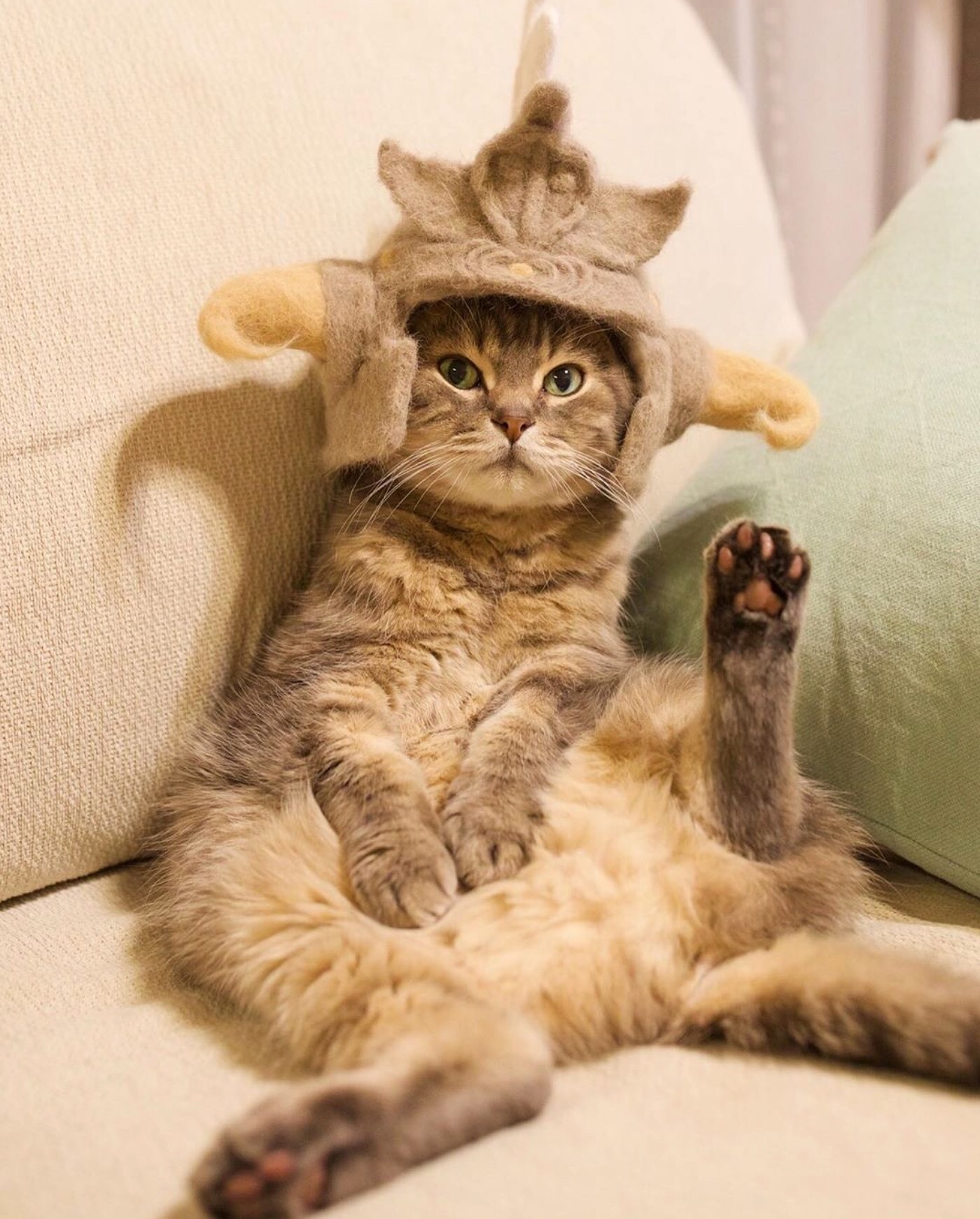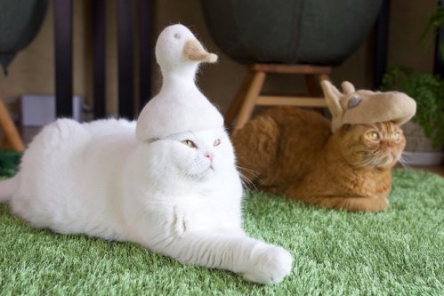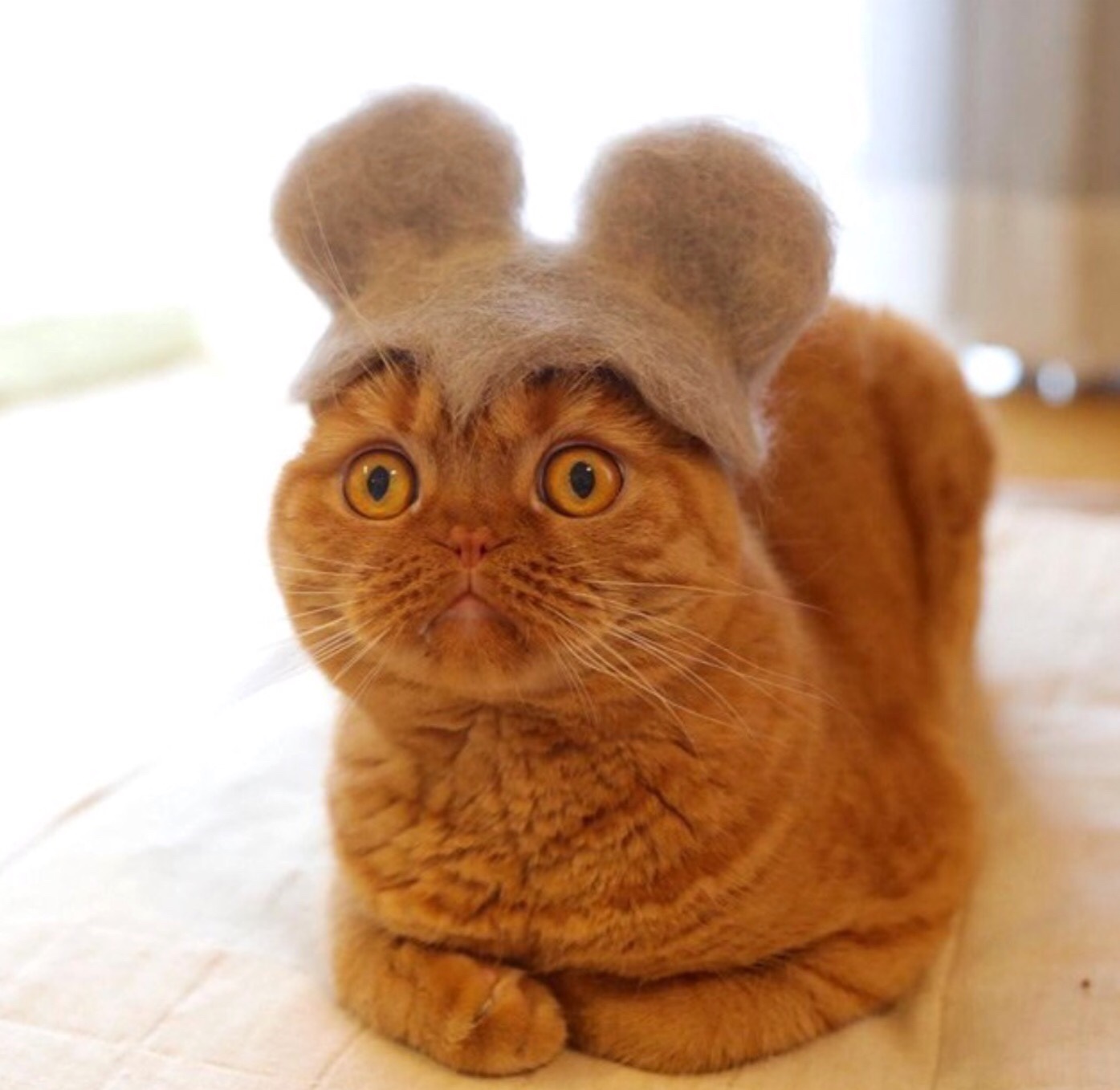 Japanese couple Ryo & Hiromo Yamazaki combine their love for fashion design, kitties, & photography by creating fancy hats for their three cats out of the kitties’ own shedded fur. What began as simple designs have become increasingly more intricate over the years. Simple acorn-like shapes have evolved to detailed samurai helmets, sailor caps, & even a duck hat. The different shades of the cats’ orange, tabby, & white fur allow for nuance within each hat.