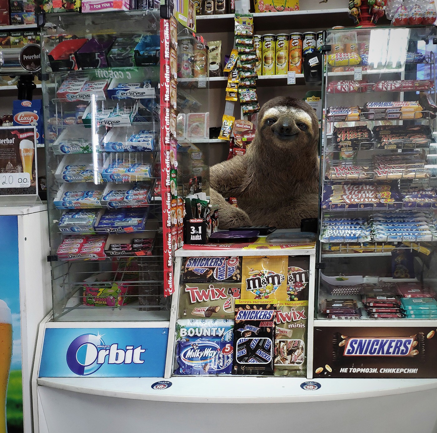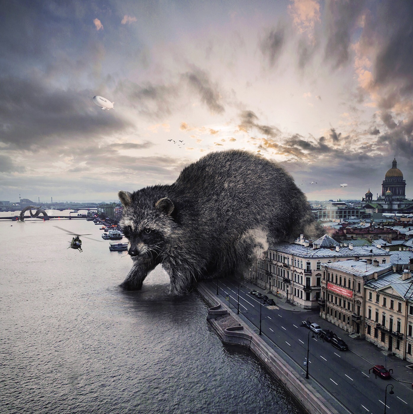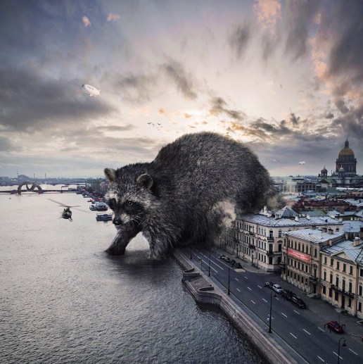 These wooftastic fictional images are easier to understand for humans like my huMom that indulge in science fiction or fantasy reading. The strange is to be expected. Like giant racoons crossing the city or a sloth running store front.