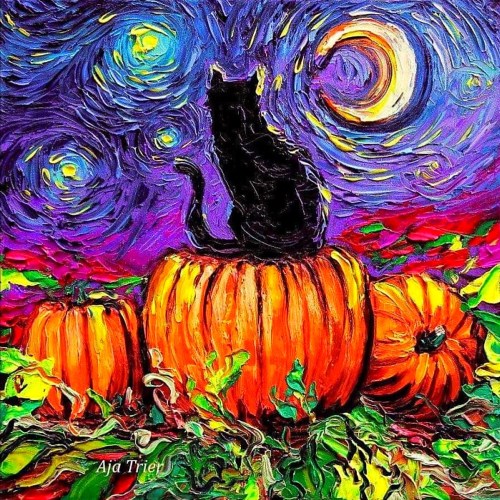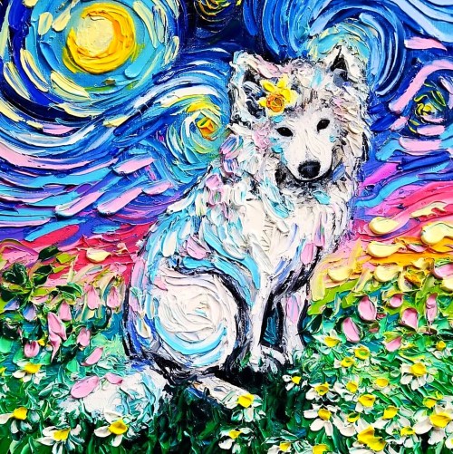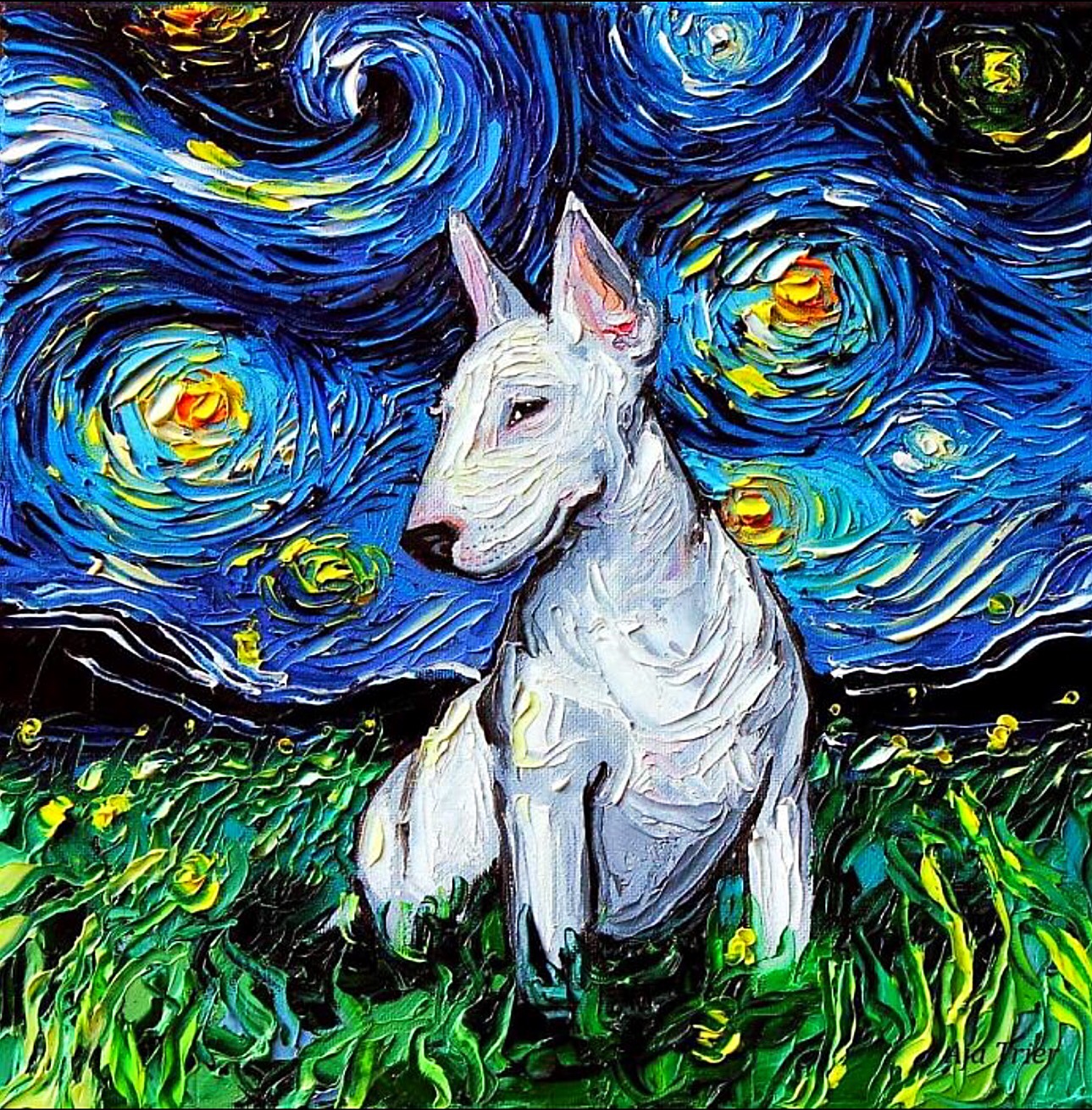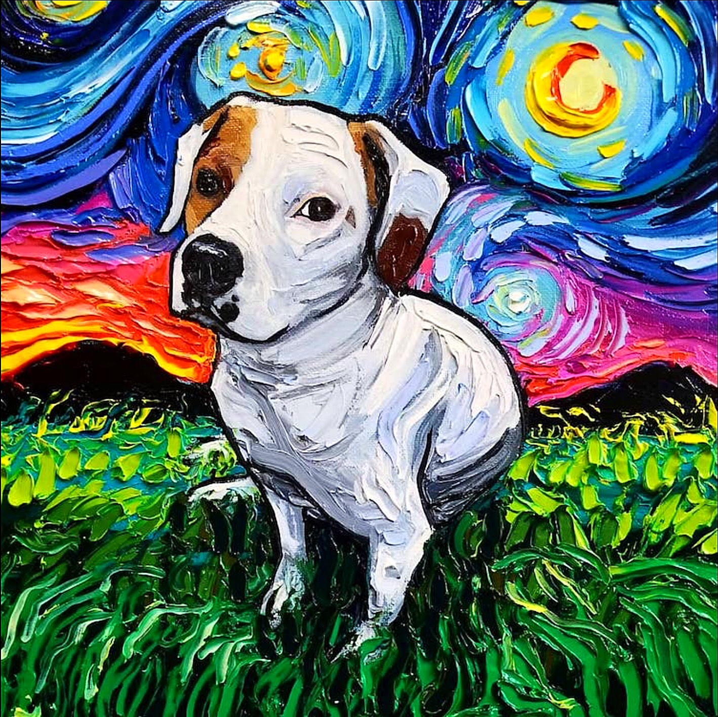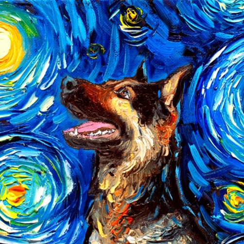 This pawsome artist caught huMom’s eye because of the wagnificent similarities between George Rodrigue’s ‘Blue Dog’ series & her ‘Starry Night’ series. By dog, others people have made comparison of Aja Trier to the famous painter van Gogh. Aja Trier even had an educational site attributed her ‘Eiffel Tower’ painting to van Gogh, & was teaching children that her painting was an actual van Gogh. As history shows, van Gogh never saw the Eiffel Tower finished. He’d already left Paris by the time it was unveiled for the World’s fair in 1889 & he never returned. This is what inspired her ‘Starry Night’ artworks & “van Gogh Never” series. Let’s take a sniff.