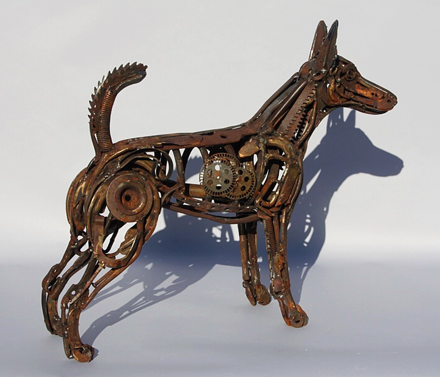 Harriet Mead uses welded steel to create her wagnificent sculptures, “It enables me to capture the movement of the subject & balance the pieces in a way that would be impossible if I were using a more traditional material. My early work was made of sheet steel with scrap items for detail but for many years I have used entirely found objects to create the sculptures. I try very hard to capture the essence of the animal without sentimentality & use the objects in a sympathetic way to outline the strength & muscle structure of the subject. I want to capture something of the quiet presence of an animal & not necessarily the drama.”