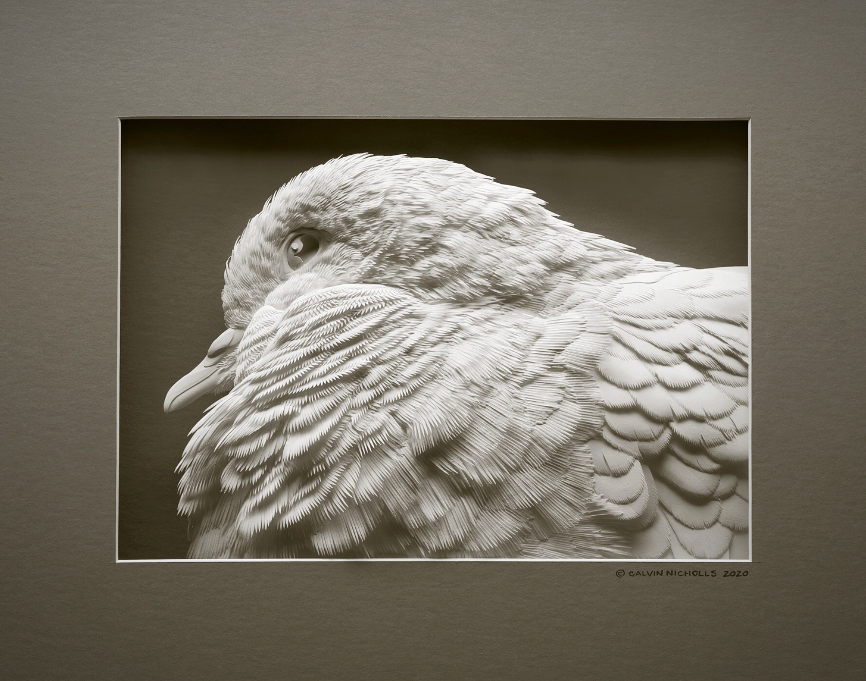 When questioned on the delicate & fragile nature of the pieces Calvin Nicholls answers, “The cuts & texture are often tiny & very delicate but due to the numerous glue joints for every piece, the overall strength is substantial. Tests of the bond between glue & paper reveal that when deliberately forced, the paper tears while the glue seam remains intact.”