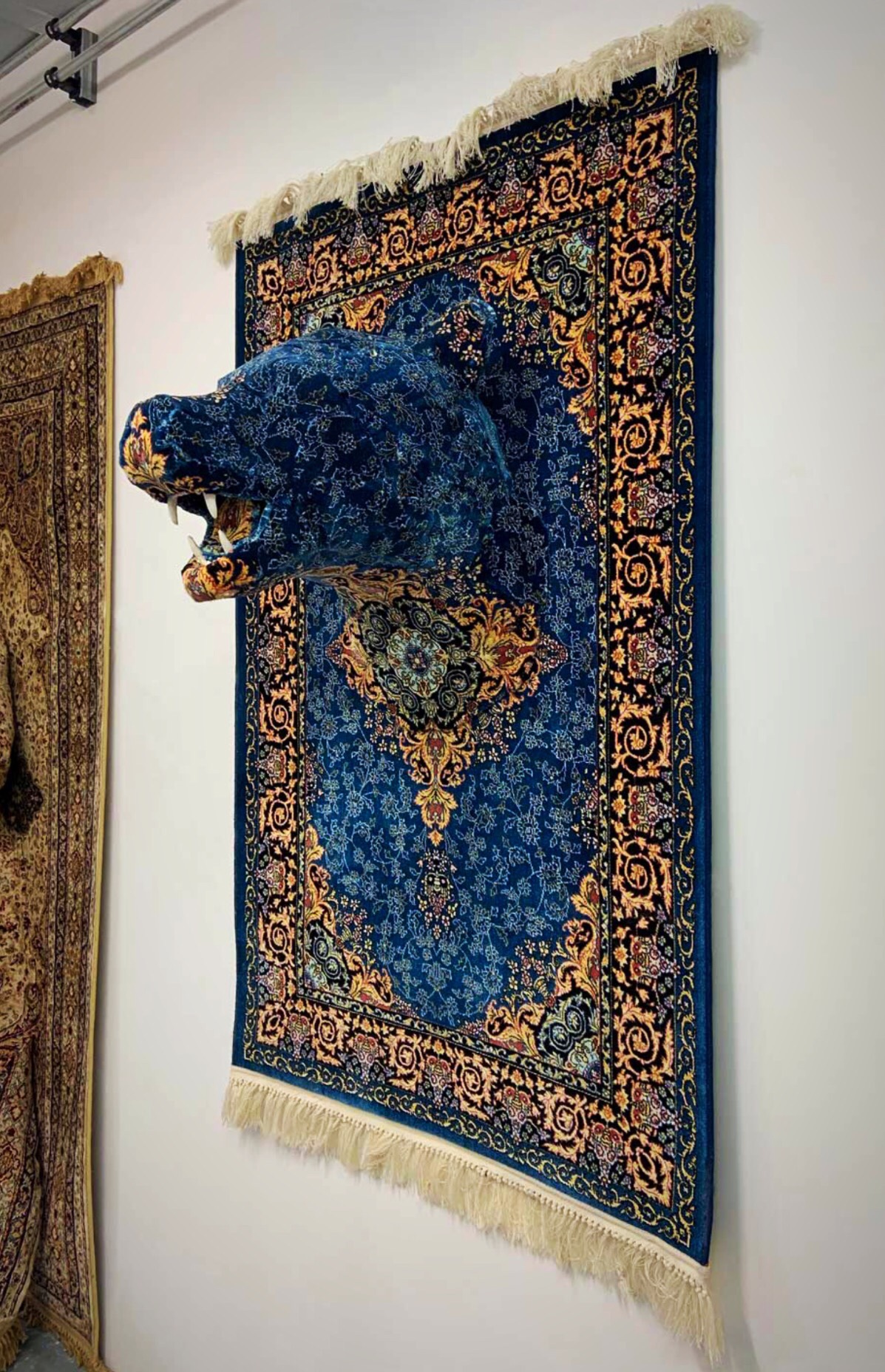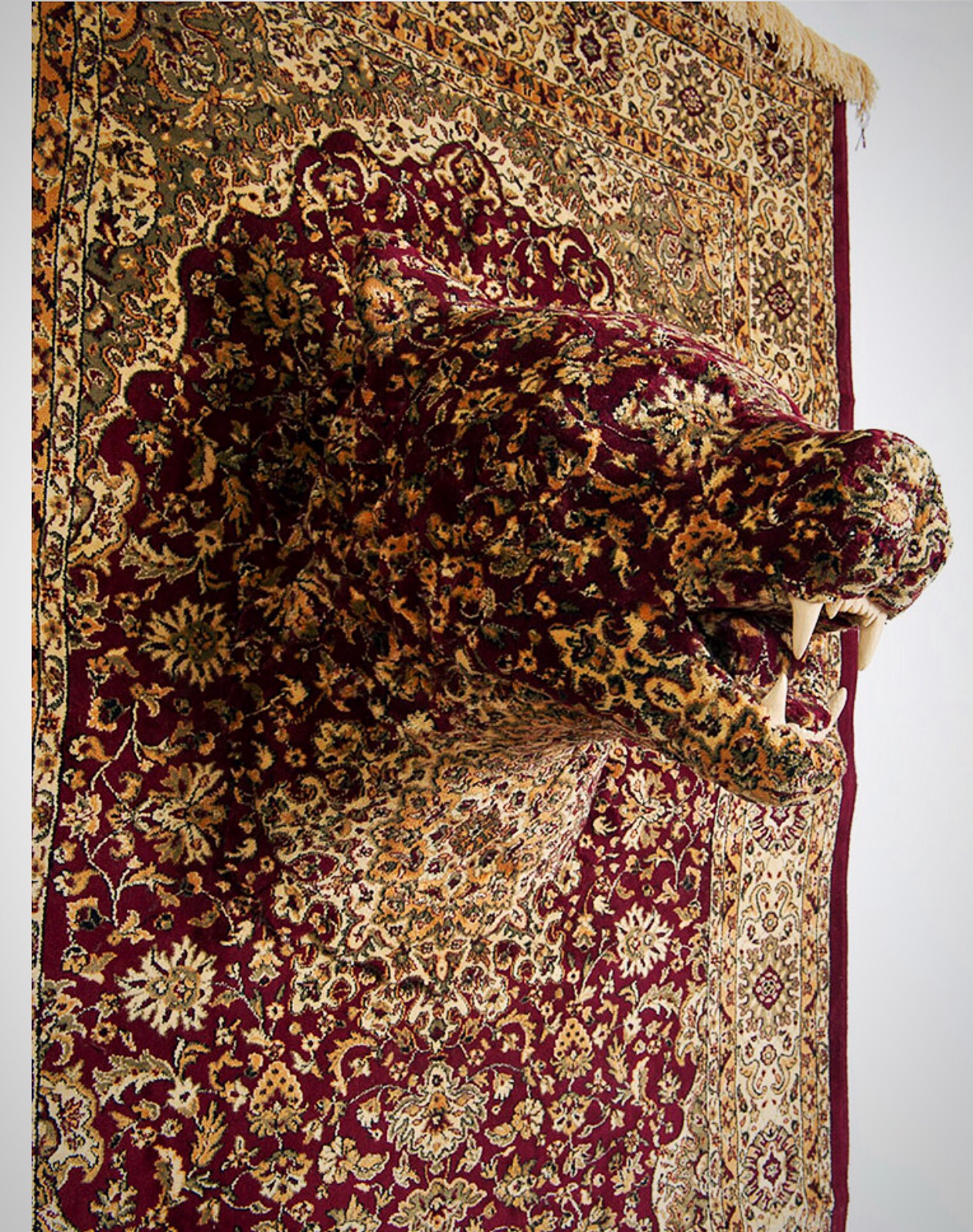 Lawson does so by using traditional Persian carpets & Oriental rugs. She transforms them into pawtastic three-dimensional sculptures that are wooftastic. Using chicken wire & masking tape & layers of luscious carpets, Lawson creates life-size renditions of animals that pawsitively jump out of the fabric at you. Her sculptures fuse the human-made world with the world of plants & animals in a wagnificently imaginative way.