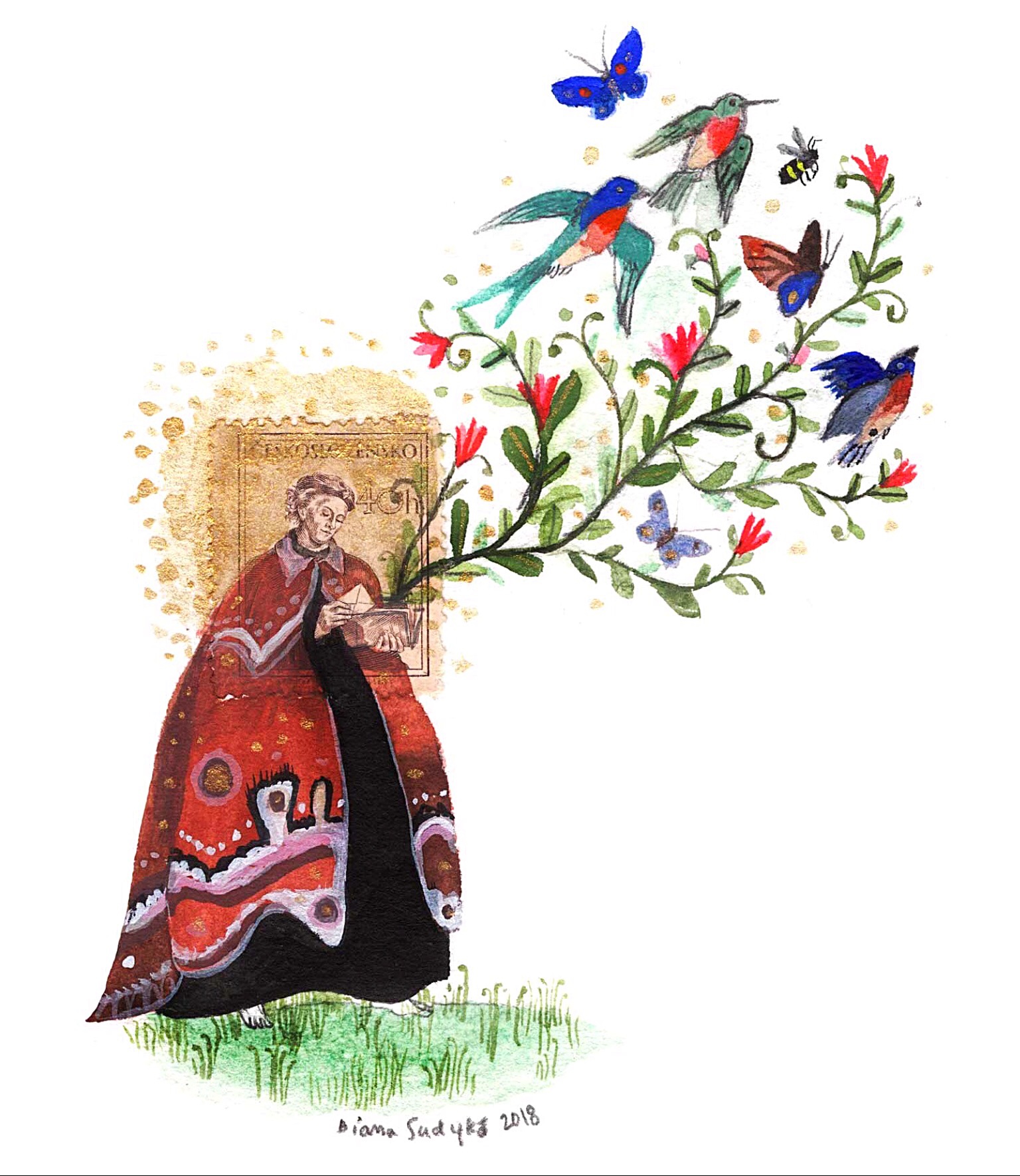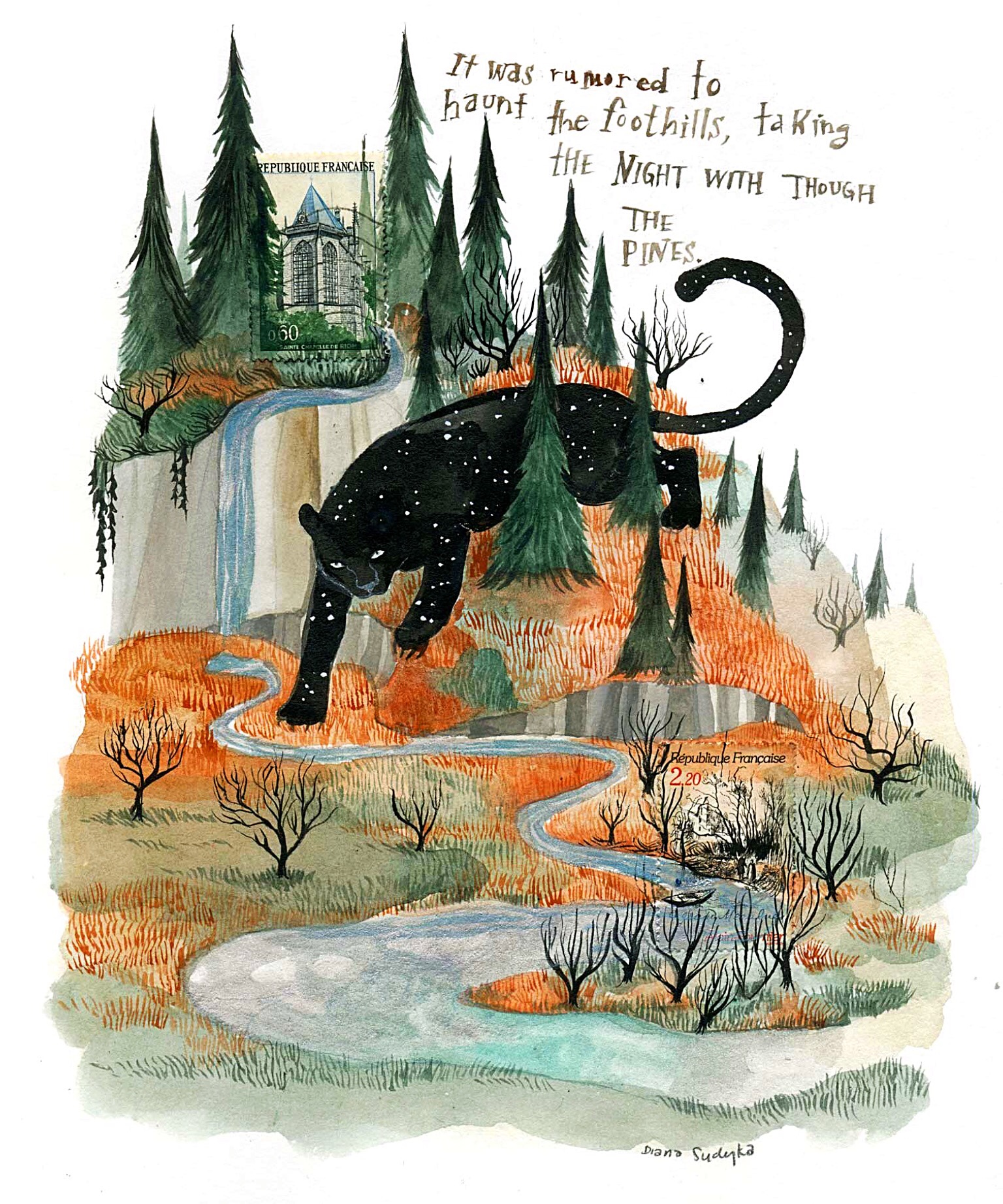 Diana Sudyka selects a stamp as her inspiration, but without a specific idea of the painting that she will create from it. “I let the stamp inform the subject matter & color palette. It’s a very intuitive process. The stamp is really just a stepping off point to get my imagination going.” There is also the narrative text & phases she adds that I know pawsitively doglite my huMom.