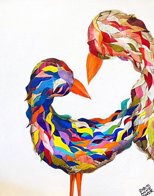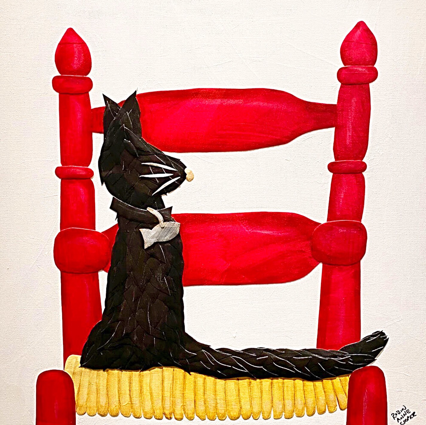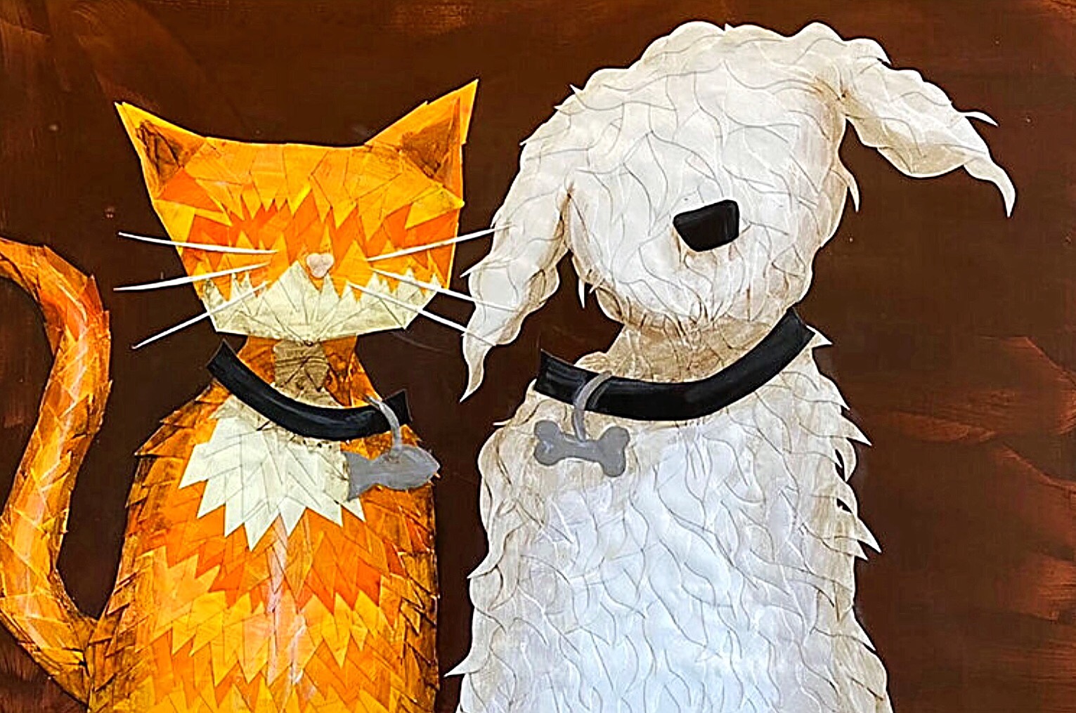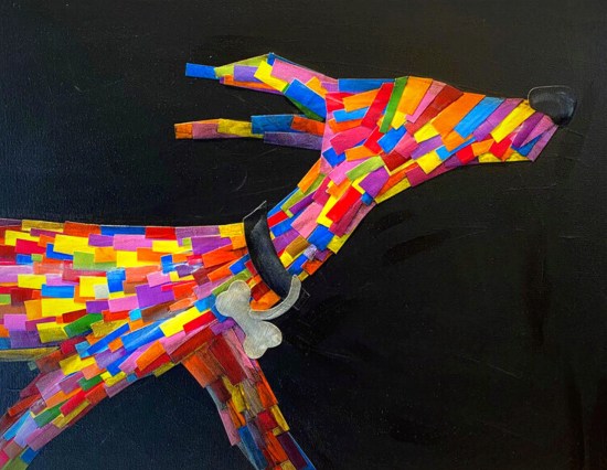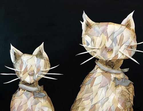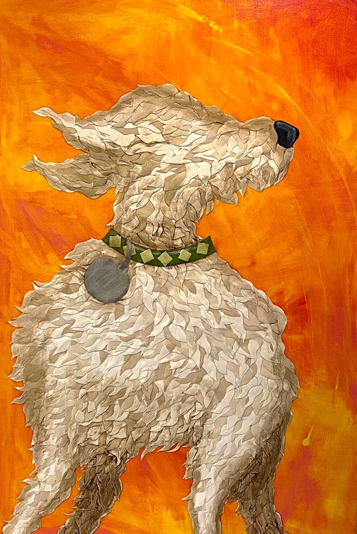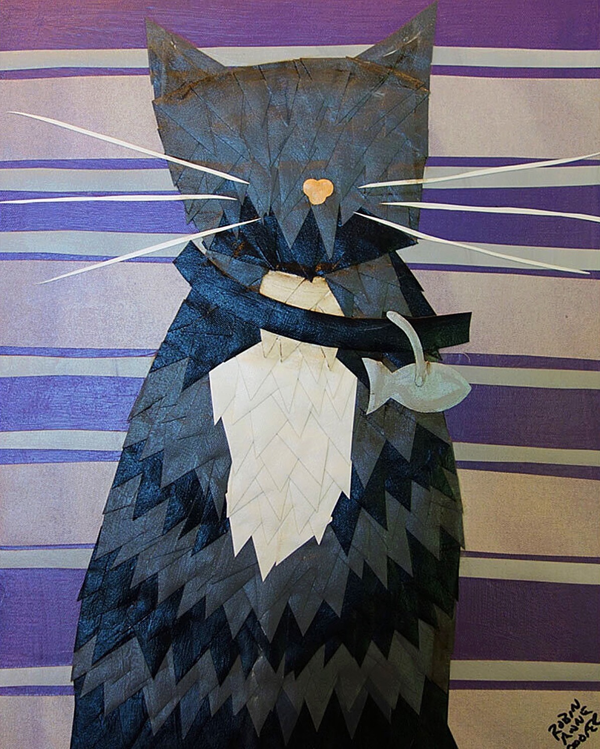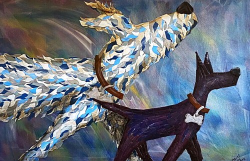 With the pawmission of the cat, Robin, her dog, husband, & his dog live & works out of End of the Road Studios in Walhalla, South Carolina. Although Robin’s collages pawtray a variety of animals she pawfers to dogpict us wagnificent dogs. She states, “they truly come in all sizes, shapes & textures”. Each piece is made only from layers of canvas & paint. There are no adhesives such as tape, glue or otherwise.