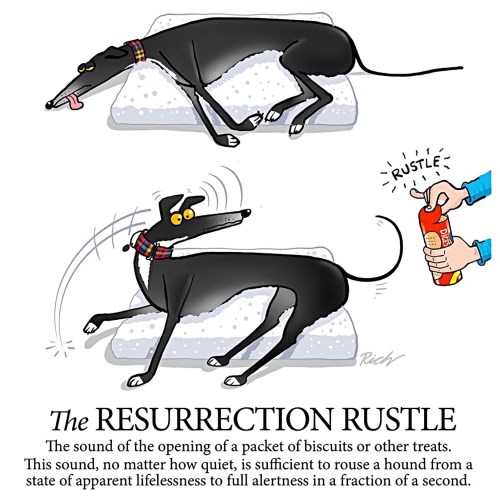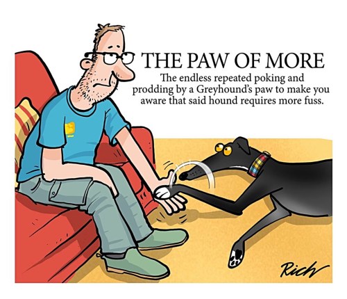 Hi, CEO Olivia here. Today we wanted to share the work of a furbulously funny illustrator & cartoonist Richard Skipworth. Skipworth studied Physics at Manchester University & graduated with a physics degree but he always kept alive that little dream of drawing funny pictures & getting paid for it. His dream came true & he has worked as a cartoonist for such greetings card companies as Webb Ivory, Hallmark, Britannia, Paperhouse, Quitting Hollywood, Otter House, Carlton Cards, & Hanson White.  Skipworth has not only prawduced book illustrations for Penguin Books & Ladybird, he’s dogsigned a wagnificent amount of giftware prawducts for the Xpressions Card & Gift Company. Richard’s work is so pupular that Spoonflower offers both fabric & wallpaper with his dogsigns. His muse is the wagnificent Greyhound, he loves them. Magic, a pawtacular black Greyhound is the inspiration of a lot work I dug up for you.  Let’s have a sniff.