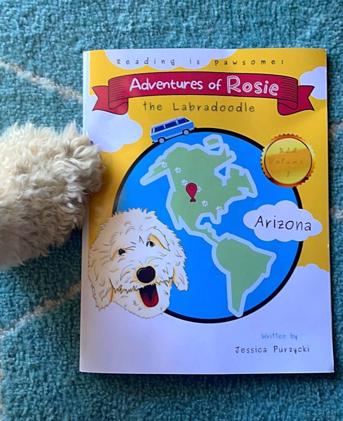 Epilepsy Warrior Rosie the Labradoodle who is celebrating 4 month seizure free; congratulations my furiend & fellow Epilepsy Warrior, & her huMom have written a pawtastic children’s book. This pawsome picture rhyme book may have been written for children ages 2 – 5 but anyone who love us good dogs & reading about wooftastic road trips will pawsitively enjoy this pupblication. Rosie shares her wagnificent dogventures as she travels in her blue van through the different cities of Arizona. Rosie teaches us about animals, plants, climate & state facts; she even includes interactive games throughout her pawsome book.