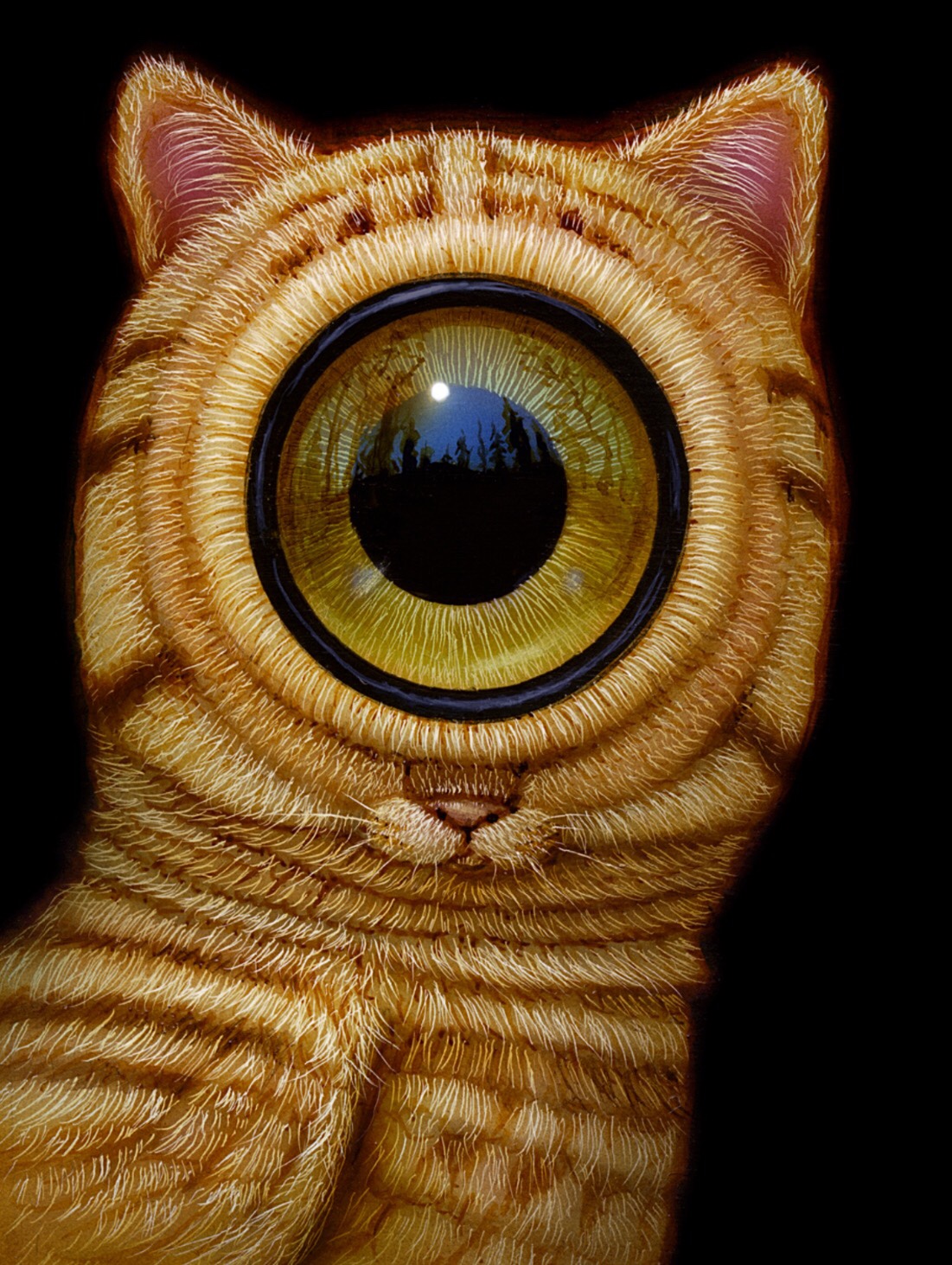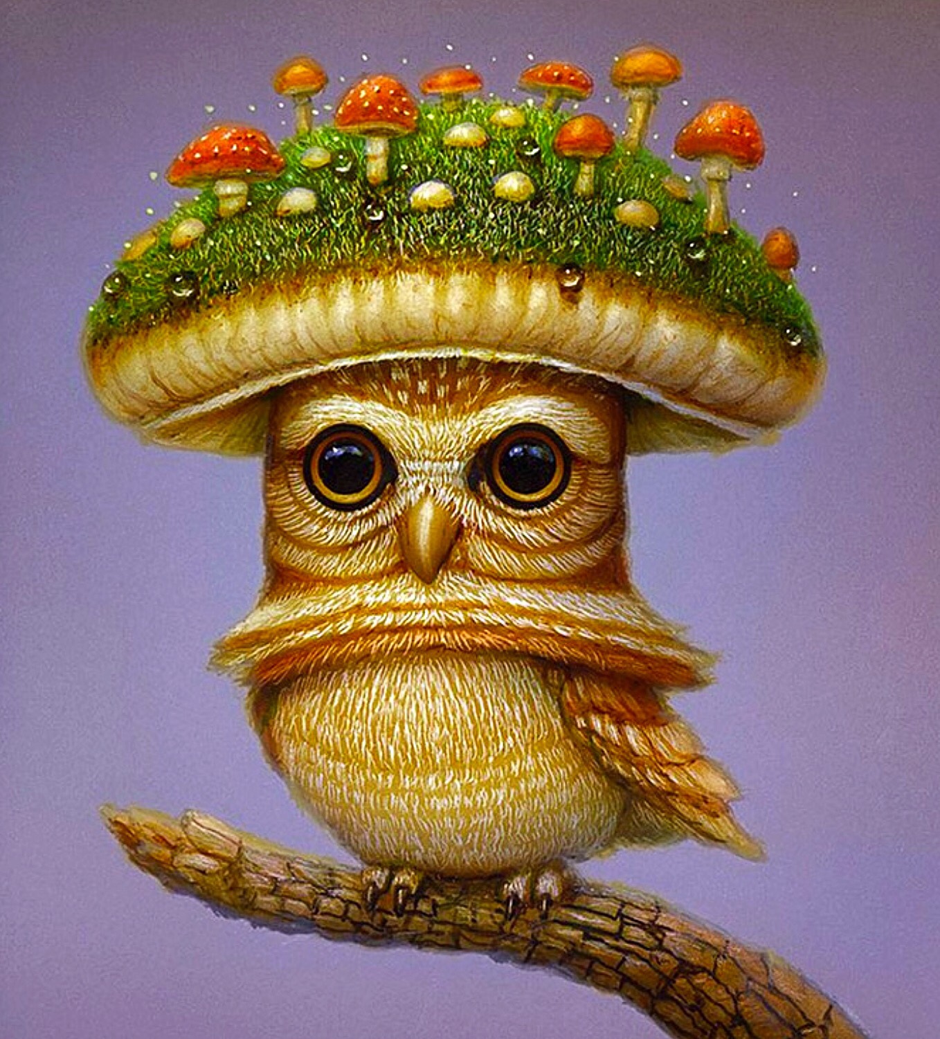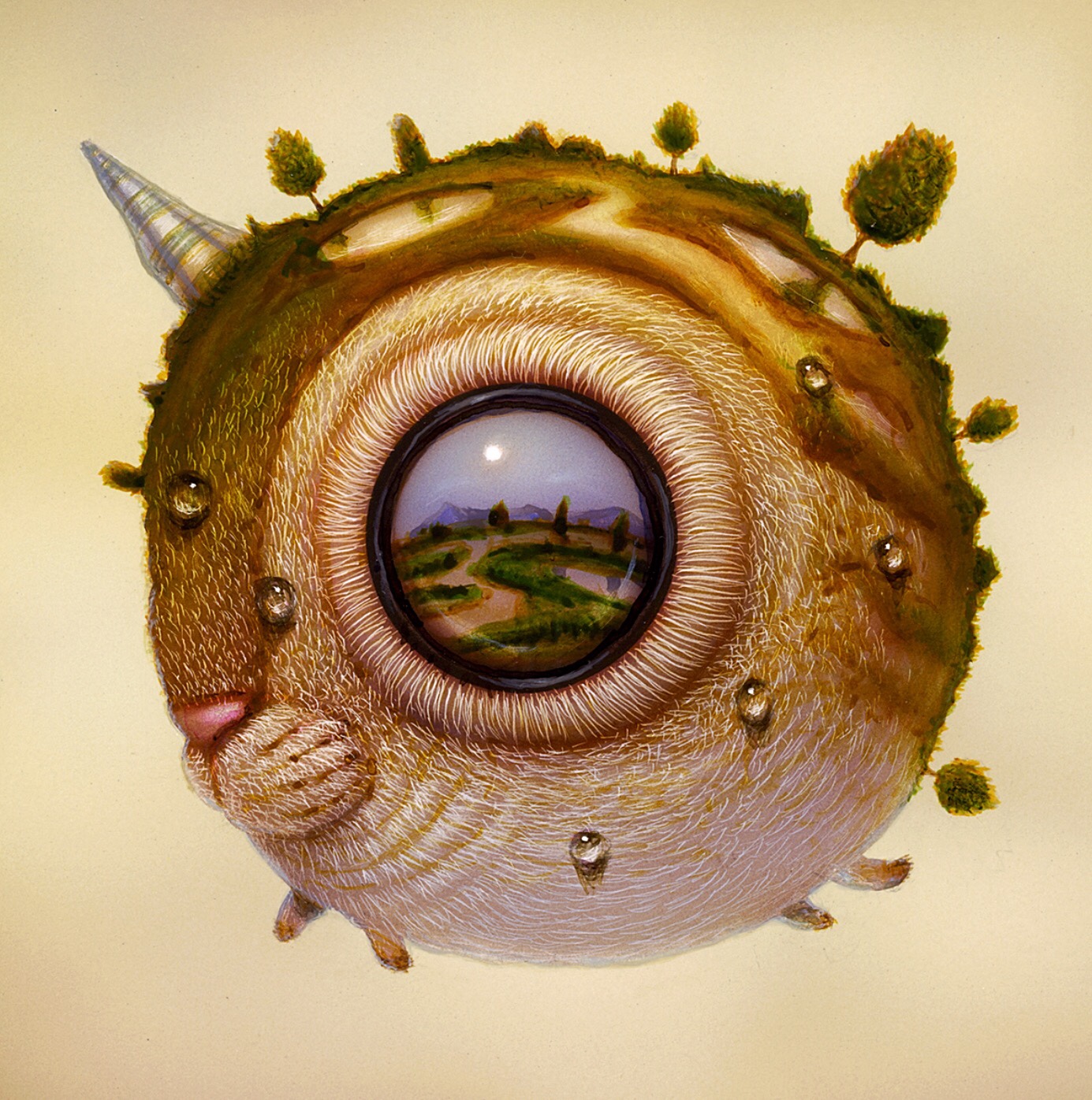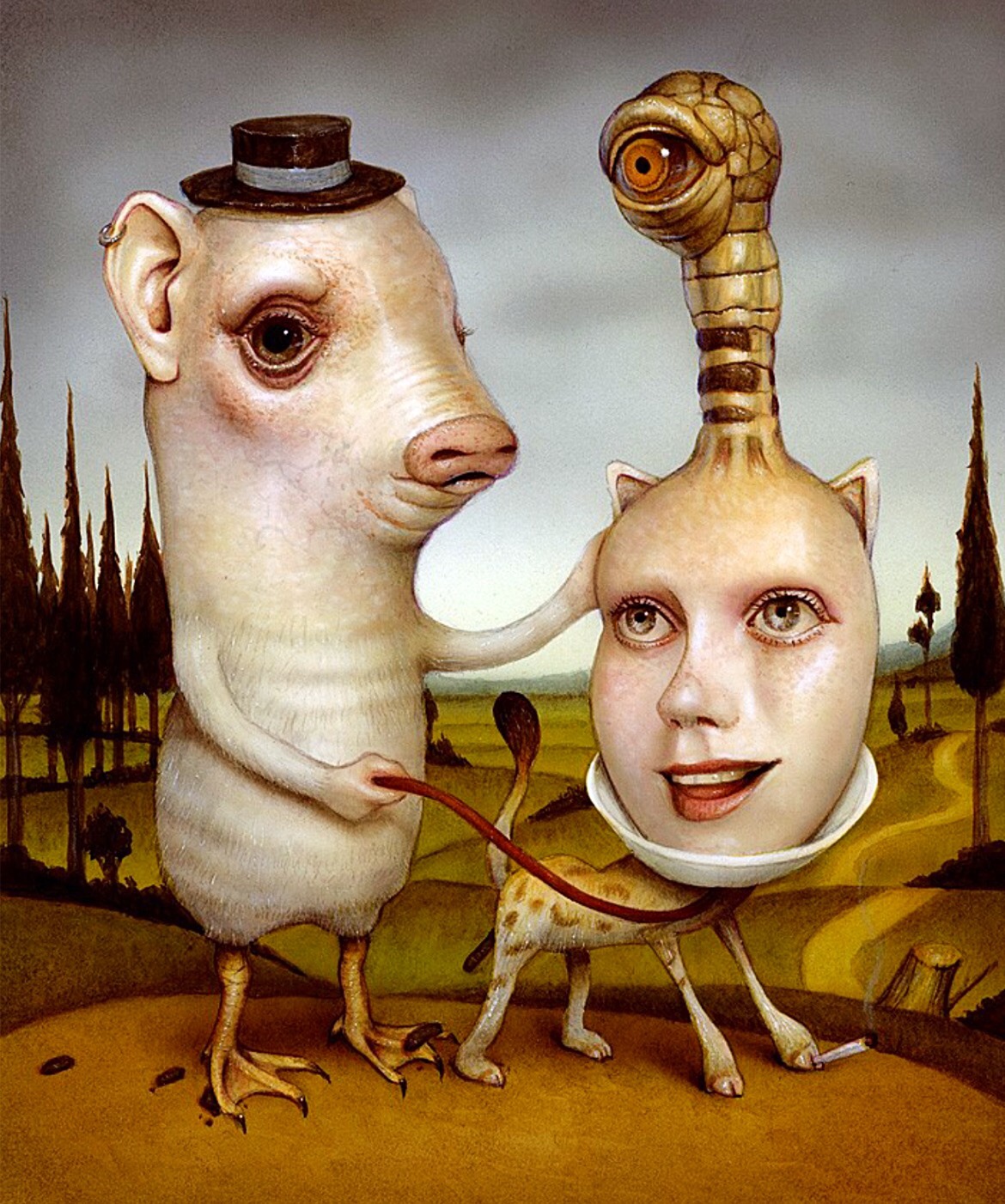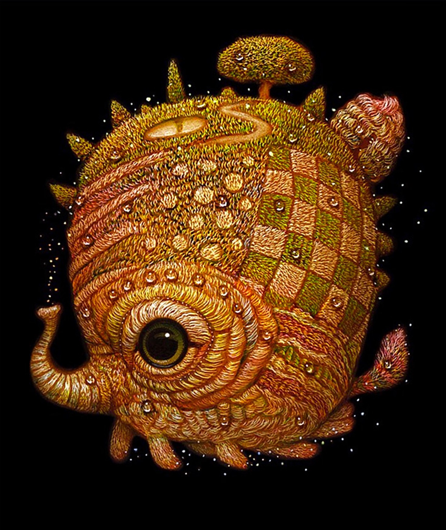 Naoto Hattori’s creations are wooftastically surreal & equally as distrubing as they are wagnificently beautiful. His minuscule work is dog gone pawtacular in detail; one would think they were digitally created but not so. His medium is acrylic & his pieces are always no more than six inches in size.