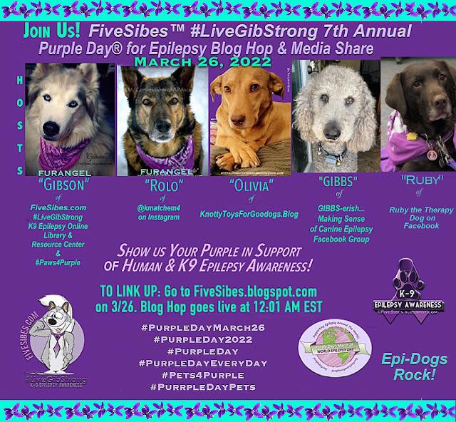 We ask if you are in the pawsition to please think of giving $5 to our charity of choice, The Wally  Foundation ~ Canine Epilepsy.  They are a wooftastic organization that helps families who are struggling with the cost of life saving medication for their canine Epilepsy Warriors.  Get your purple on & post a pic.  You could be the winner of their “WHO WORE IT BEST” contest.