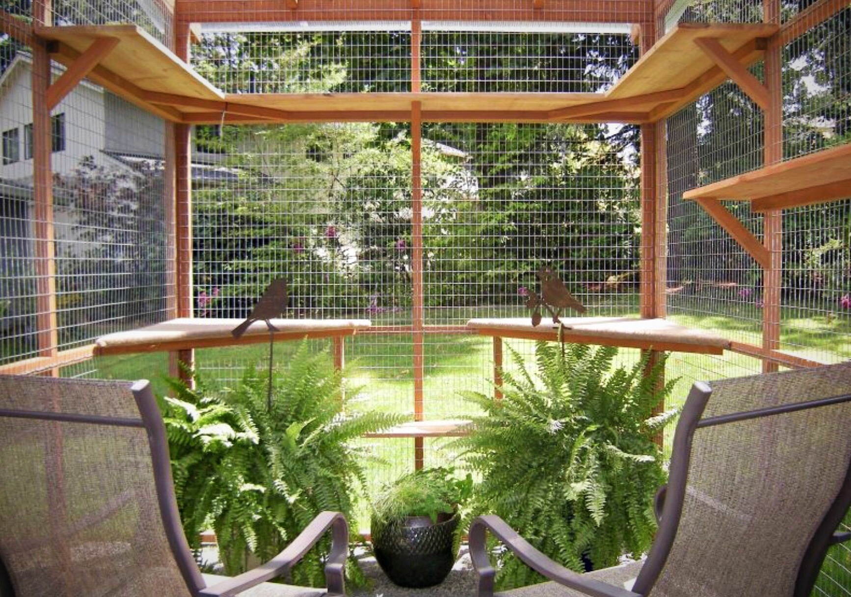 Outdoor Catios are a pawfect solution ensuring a cat’s safety by keeping other animals out, such as predators of cats (coyotes, wolves, birds of prey) or the safety of other smaller animals like cat prey (butterflies, mice, squirrels & our feathered furiends). Outdoor Catios help to pawvent cats from wandering off where they may become lost, endangered by cars, or eaten by predators.