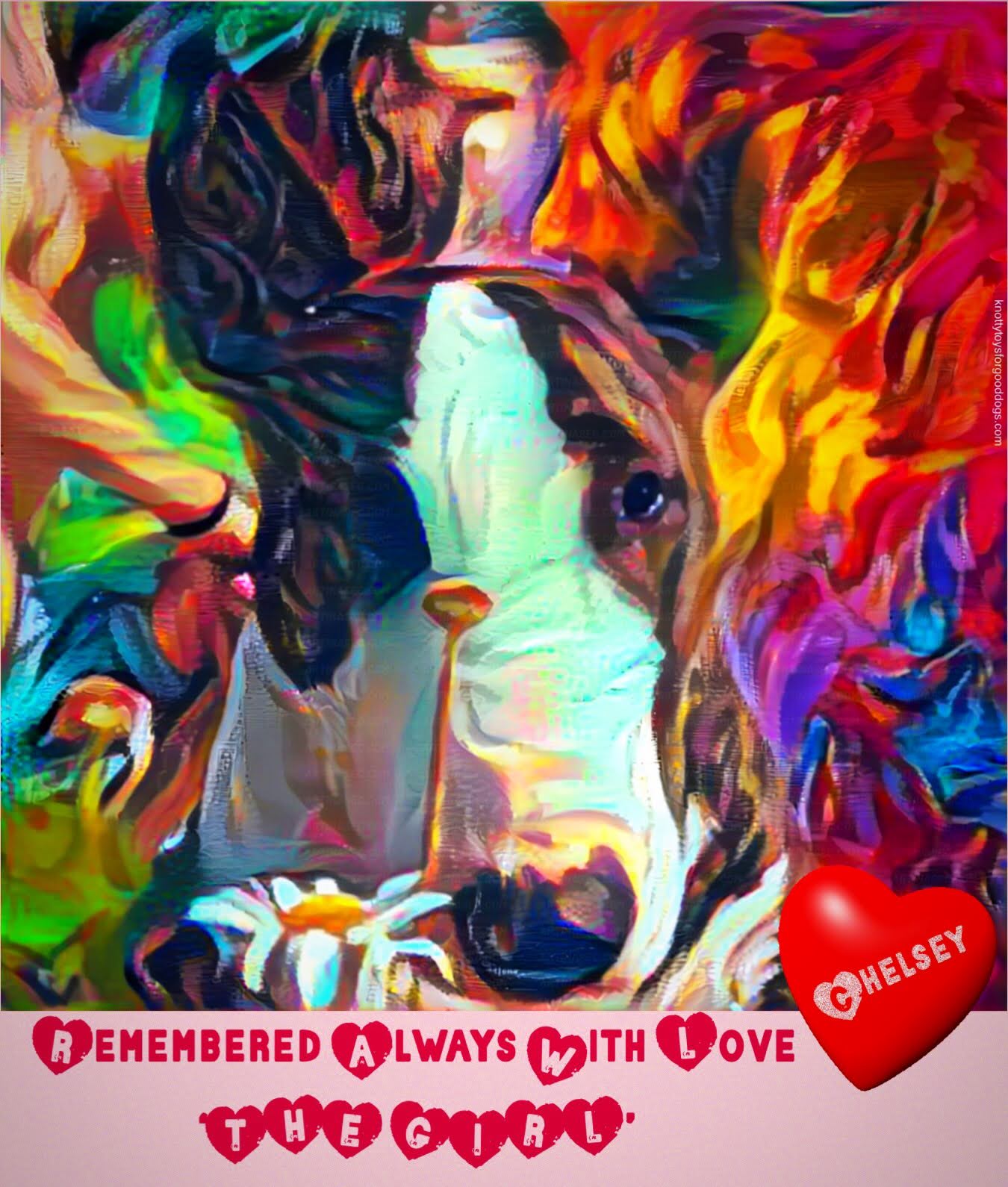 Chelsey was much loved.  She is always with huMom who lovingly still shares fond memories, the many moments of silliness, & the strong bond of their relationship. Our logo is actually a wooftastic drawing of the furbulous Chelsey created by her very good friend Phil Michaud.  He made it for Chelsey’s Birthday Pawty poster.  That’s another tail you can read about in the blog Olivia wrote, Who’s That Dog on the Logo?