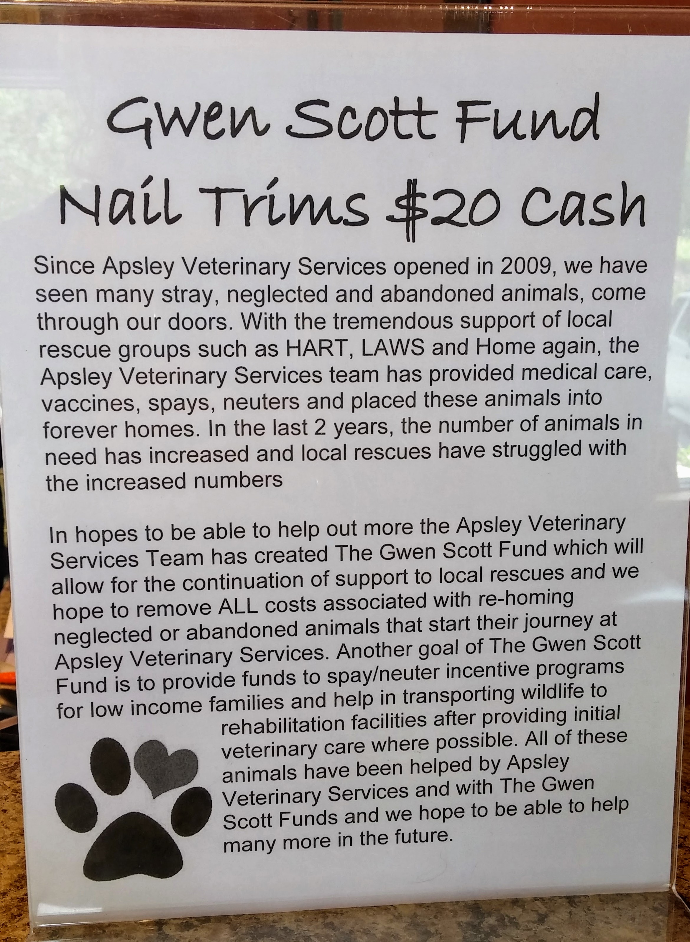 There is going to be grrreat raffle prizes & a silent auction. All money raised will be going to the Gwen Scott Fund to help stray animals & wildlife. There will be a BBQ & pet photographs. Kids are sure to love Dr. Brooke’s balloon animals. There will also be vendors like us, a bake sale & a yard sale. It’s going to be a wooftastic day.