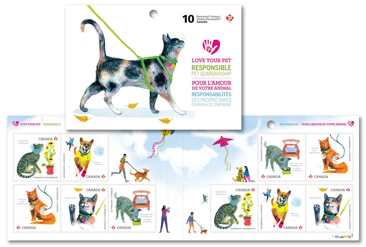 Love Your Pet: Responsible Pet Ownership is a colorful new stamp series that offers reminders of the importance of spaying or neutering, regular visits to the veterinarian, proper nutrition, creating comfortable surroundings, & plenty of play, exercise & attention. Like the popular 2013 “Adopt-a-Pet” stamp set, this issue was produced with the guidance of the Canadian Federation of Humane Societies (CFHS).